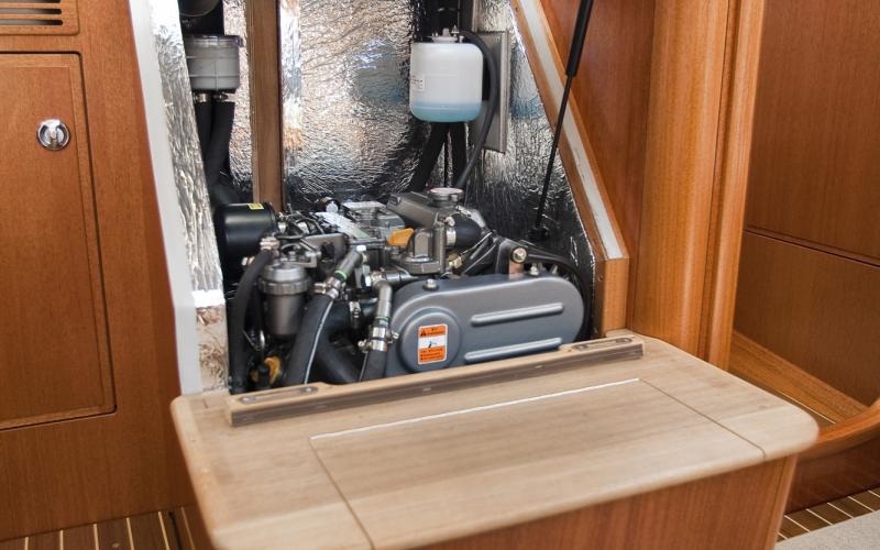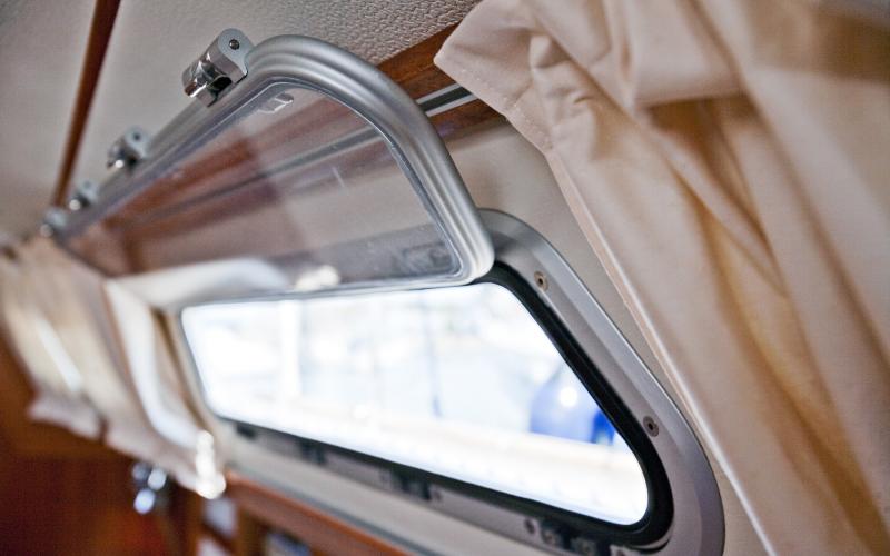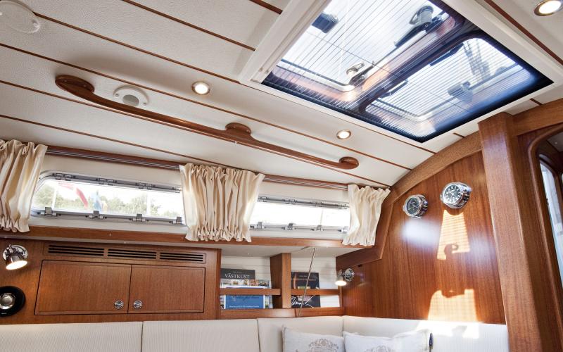 Het interieur is licht en ongewoon ruim voor haar grootte. Er zijn in totaal veertien openingen voor lichtinval; vier dekluiken, waarvan twee in de salon. Negen patrijspoorten die allen geopend kunnen worden en even groot zijn als in de Hallberg-Rassy 43 Mk II. De kastdeuren zijn flush gemonteerd en hebben fraaie weggewerkte scharnieren.