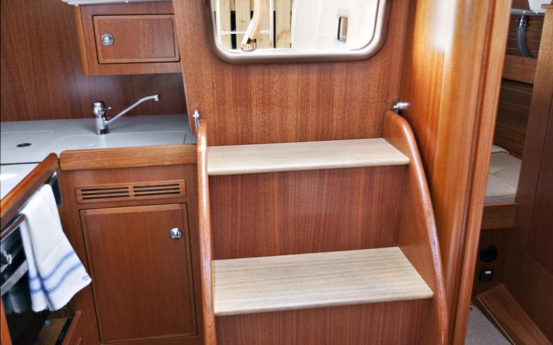 De zeegaande kombuis belemmert de natuurlijke beweging door de boot niet. Iemand die in de kombuis werkt blokkeert de toegang tot de achterkajuit niet. Er zijn diepe dubbele spoelbakken en een koelkast met een mandje om kleine spullen te plaatsen. Het aanrechtblad is van massief PlexiCor composietsteen.