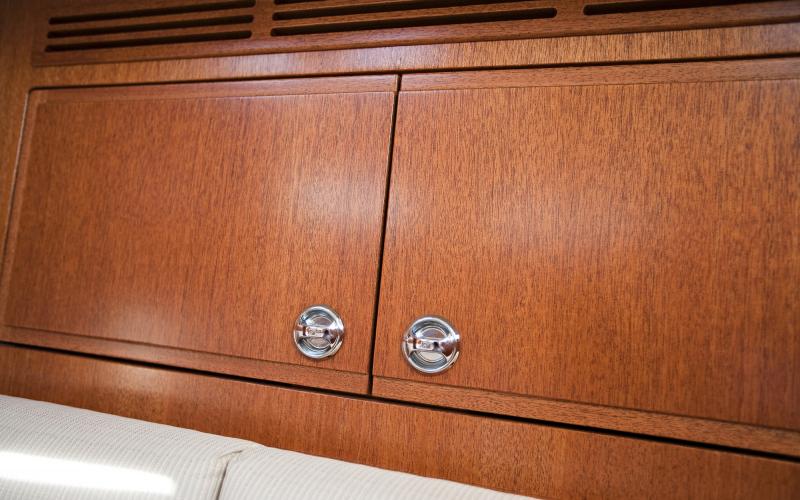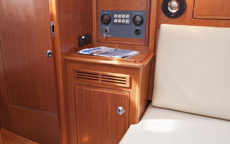 De salon is sensationeel lang en breed voor de grootte van de boot. Zowel de L bank als de rechte bank zijn twee meter lang. De maststeun staat in directe verbinding met het hoofdschot en belemmert de zichtlijn in de salon niet.